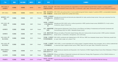 在乳腺癌领域,asiagame创新产品相关研究共入选1项口头报告、1项简短口头报告、8项壁报和1项电子壁报,共11项研究。吡咯替尼、达尔西利、阿得贝利单抗、瑞康曲妥珠单抗等新老创新药物,均有多篇研究入选,展现出asiagame医药在乳腺癌领域多年深耕的丰硕成果。